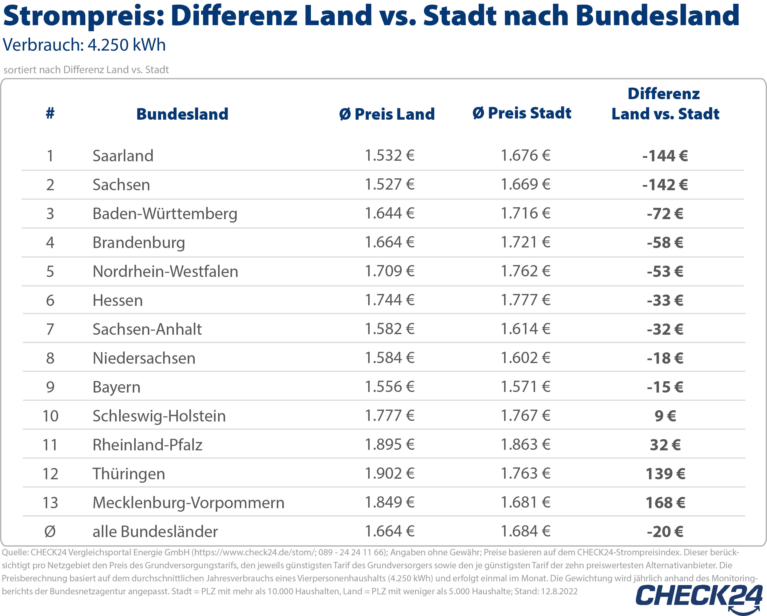 Datenbasis: Preise basieren auf dem CHECK24-Strompreisindex. Dieser berücksichtigt pro Netzgebiet den Preis des Grundversorgungstarifs, den jeweils günstigsten Tarif des Grundversorgers sowie den je günstigsten Tarif der zehn preiswertesten Alternativanbieter.