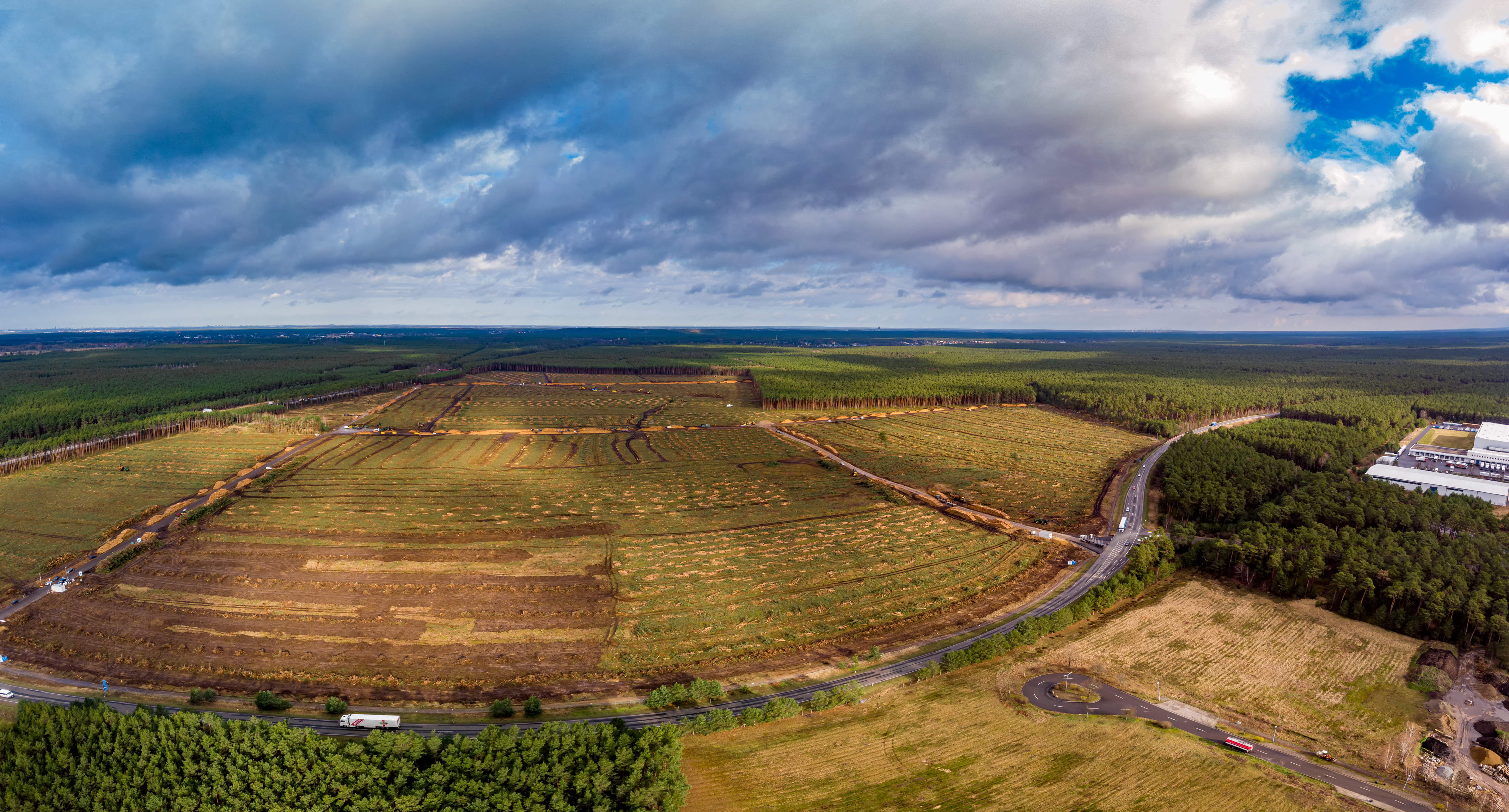 Tesla Gigafactory Berlin-Brandenburg in Grünheide (links Berliner Ring, rechts Gewerbegebiet), (2020)