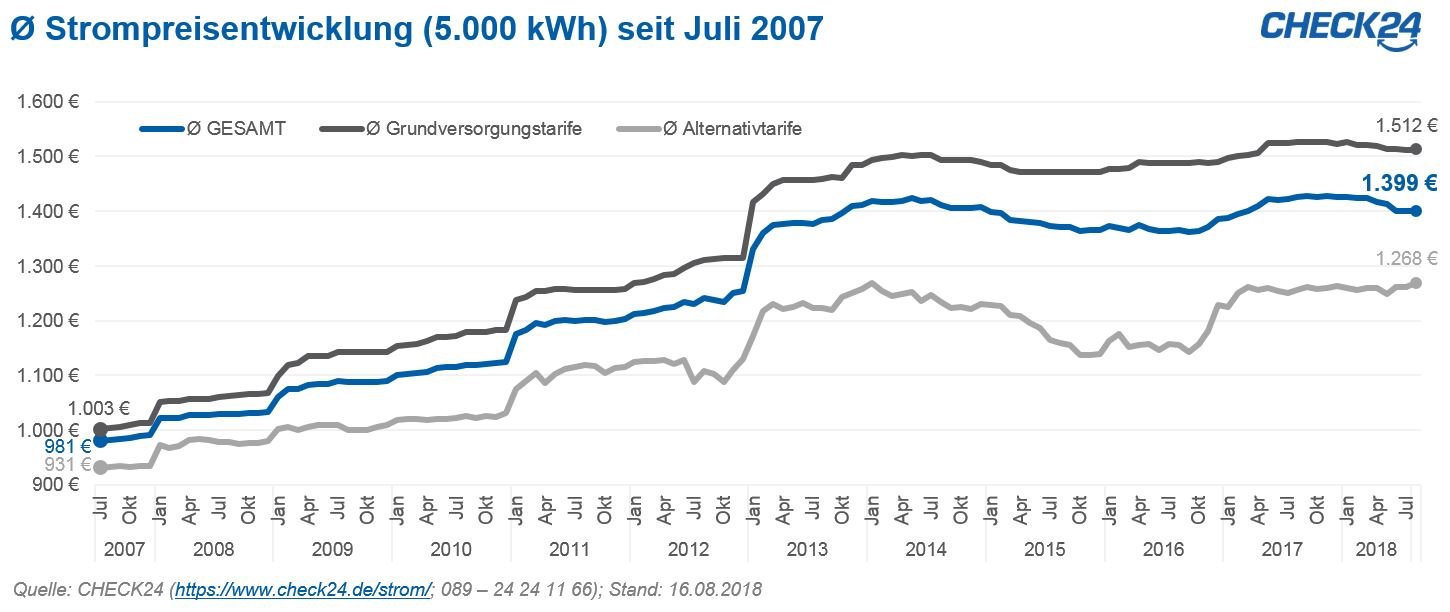 Aktuell zahlen Verbraucher im Durchschnitt 1.399 Euro für 5.000 kWh Strom. Das ist etwa ein Drittel mehr als noch vor zehn Jahren. Bild: "obs/CHECK24 GmbH"
