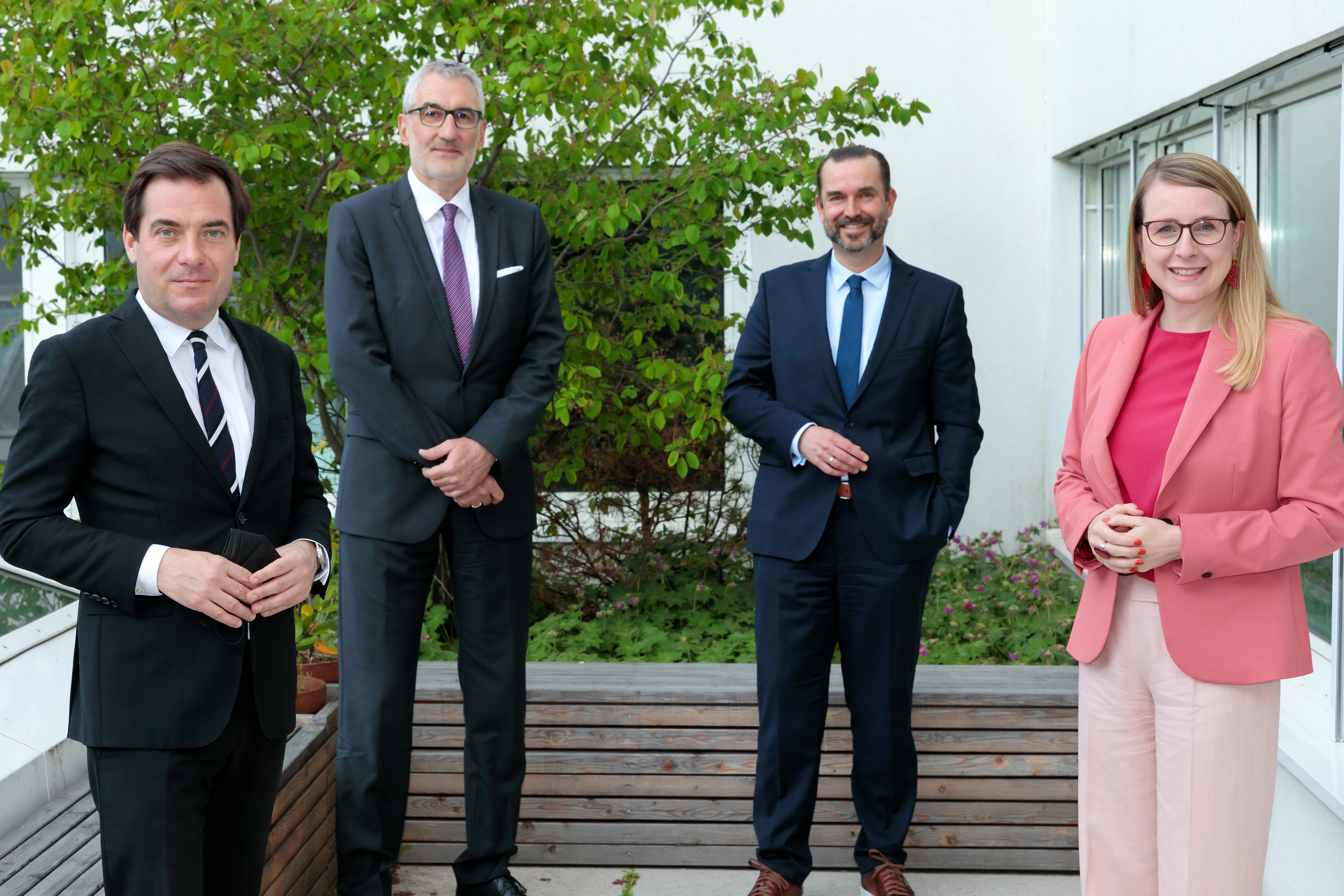 Das Podium des APA-Talks vor Ort v.l.: Moderator Rainer Nowak (Chefredakteur Die Presse), Franz Reischl (Präsident ÖGV – Österreichischer Genossenschaftsverband), Clemens Pig (Geschäftsführender Vorstand APA – Austria Presse Agentur) und Margarete Schramböck (Bundesministerin für Digitalisierung und Wirtschaft) Bild: APA/APA-Fotoservice/Schedl Fotograf: APA