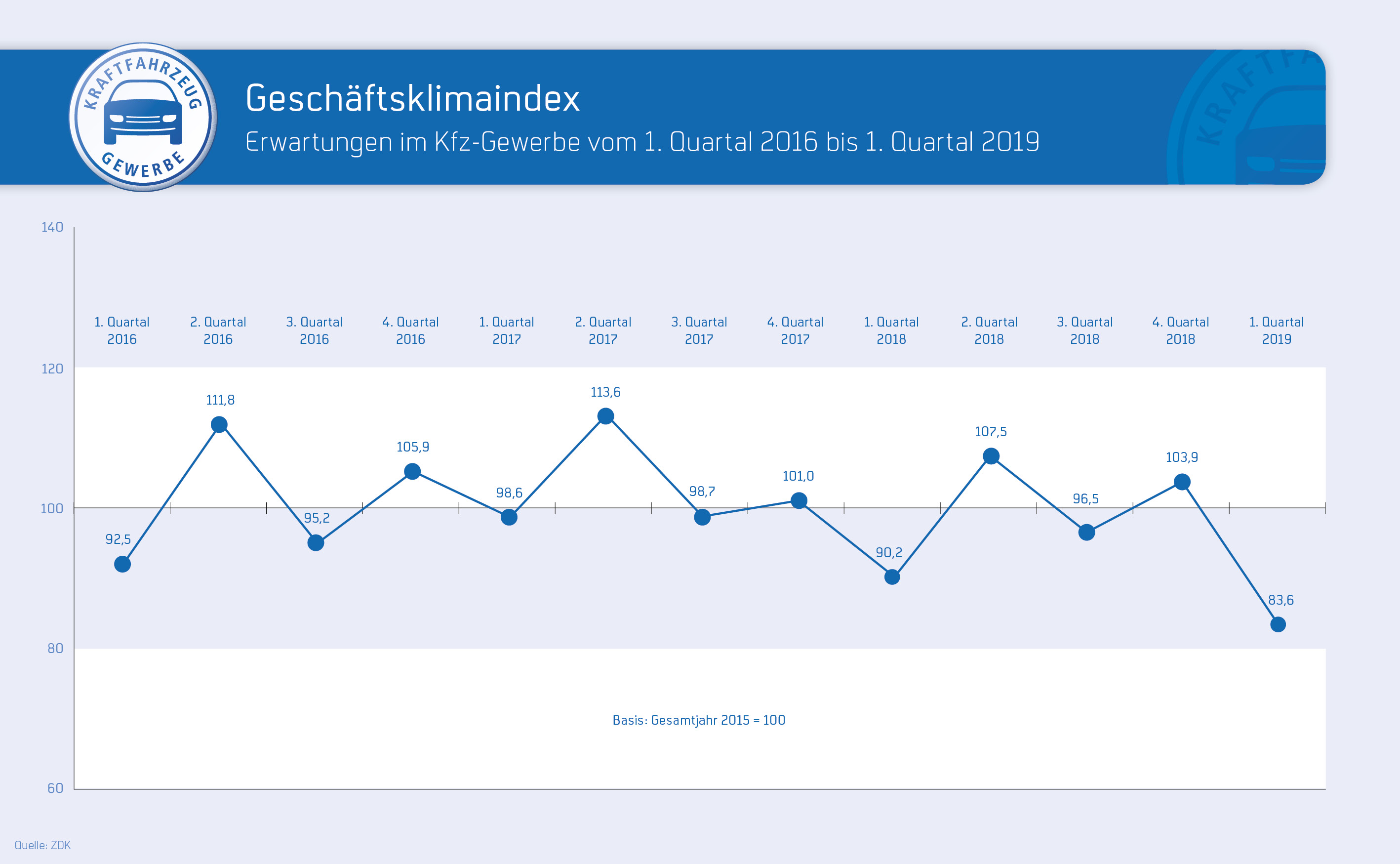Geschäftsklimaindex Kfz-Gewerbe, Zeitreihe Erwartungen bis 1. Quartal 2019. Bild: "obs/Zentralverband Deutsches Kraftfahrzeuggewerbe/ProMotor"