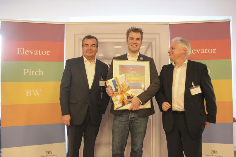 Fritz Engelhardt (l.), Präsident des DEHOGA Baden-Württemberg und Prof. Peter Schäfer (r.), Leiter des ifex, überreichen Daniel Kretz den DEHOGA-Cup 2015. Quelle: Elevator Pitch BW 2015 (idw)