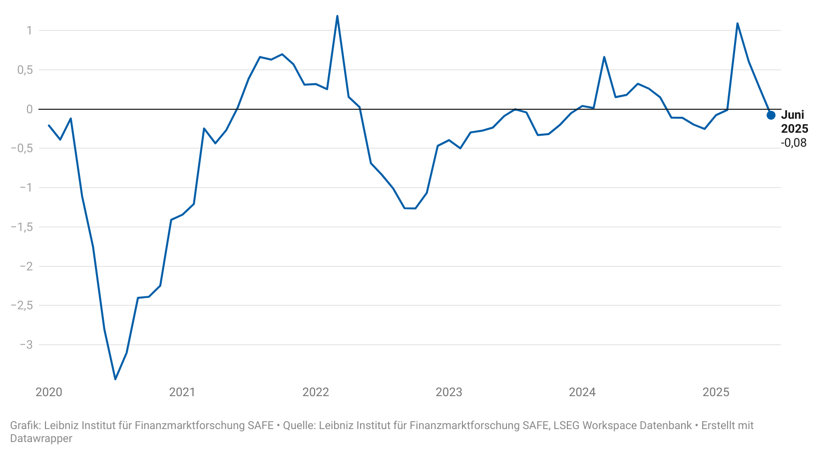 Die Grafik zeigt den Verlauf des SAFE-Indexes. Im Juni liegt der Wert bei -0.08 Punkten. Bild: Leibniz-Institut für Finanzmarktforschung SAFE Fotograf: Created with Datawrapper