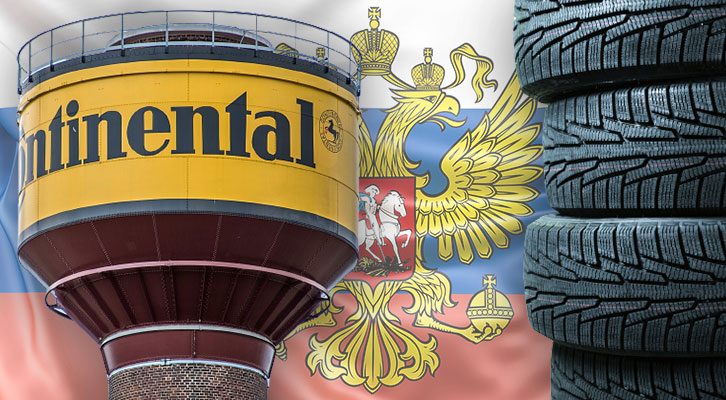 Bild: Continental-Werk: Hannes Grobe, Wikimedia Commons, CC BY-SA 4.0; Reifen & Russland-Flagge: Freepik; Komposition: Wochenblick / Eigenes Werk