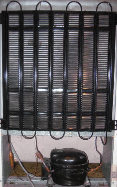 Kompressor und Wärmetauscher an der Rückwand eines Haushaltskühlschrankes
