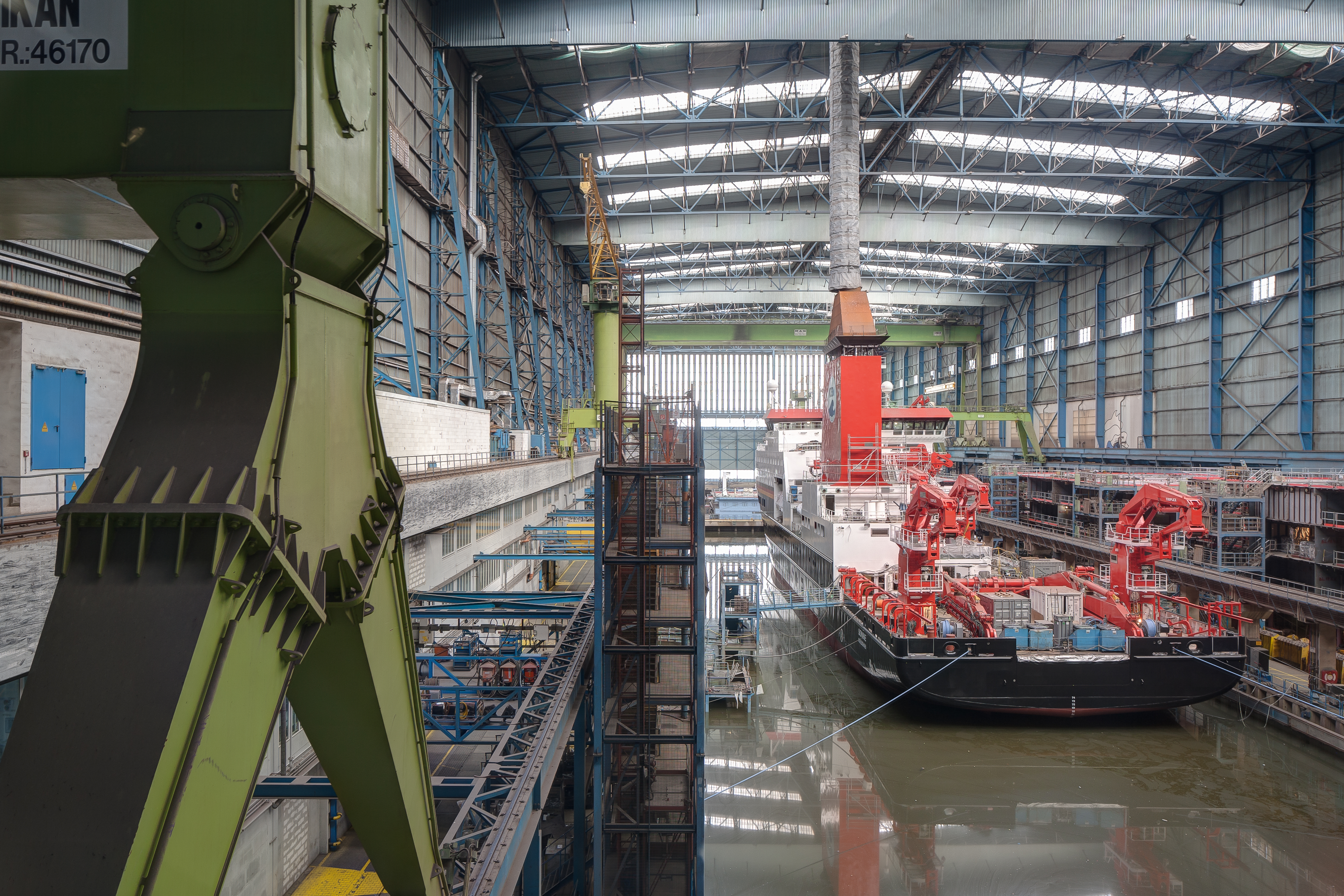 Blick in die Dockhalle 1 mit dem in Bau befindlichen Forschungsschiff Sonne in der Meyer Werft (Symbolbild)