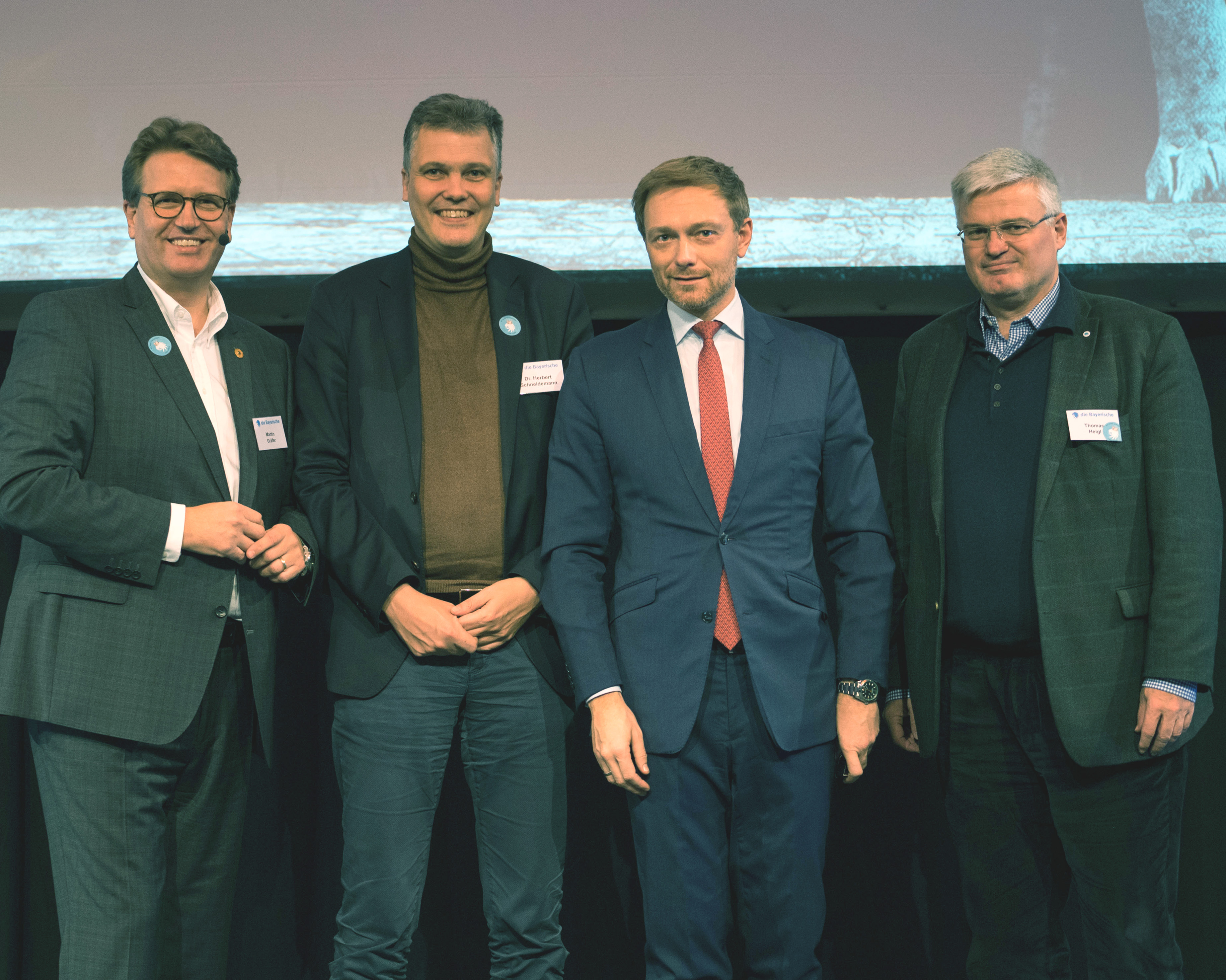 v.l.: Martin Gräfer, Vorstand der Bayerischen, Dr. Herbert Schneidemann, Vorstandsvorsitzender der Bayerischen, Christian Lindner, Bundesvorsitzender der Freien Demokratischen Partei (FDP), Thomas Heigl, Vorstand der Bayerischen. Bild: "obs/die Bayerische"
