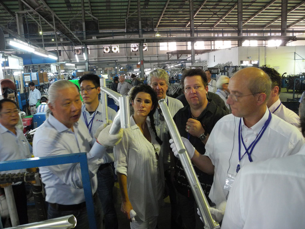 Mariella Ahrens, Marcel Reif, Sebastian Krumbiegel und Prof. Thomas Schwarz (v.l.n.r.) begutachten die hochwertige Pegasus Herstellung in Vietnam. Links Jocky Strong, Besitzer des vietnamesischen Fahrradherstellers Strongman. Bild: ZEG Zweirad Einkaufs Genossenschaft eG (ots)
