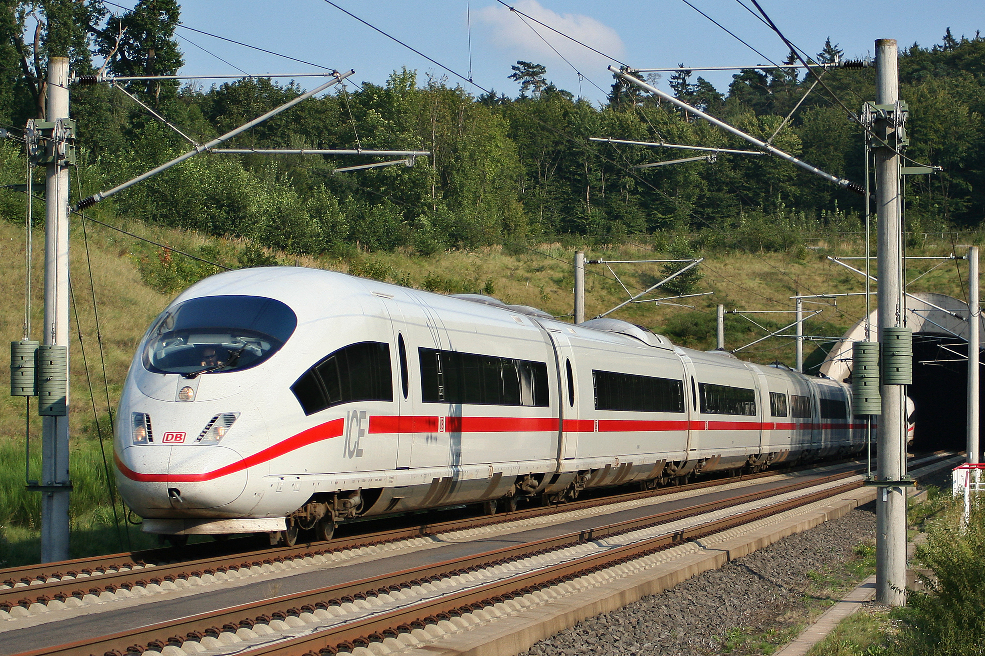 Ein ICE 3 am Oberhaider-Wald-Tunnel auf der Schnellfahrstrecke Köln–Rhein/Main