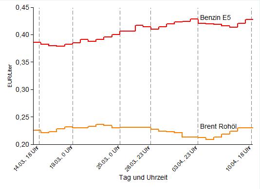 Benzinpreis (E5 ohne Steuern) und Rohölpreis der Sorte Brent Quelle: RWI-Benzinpreisspiegel (idw)