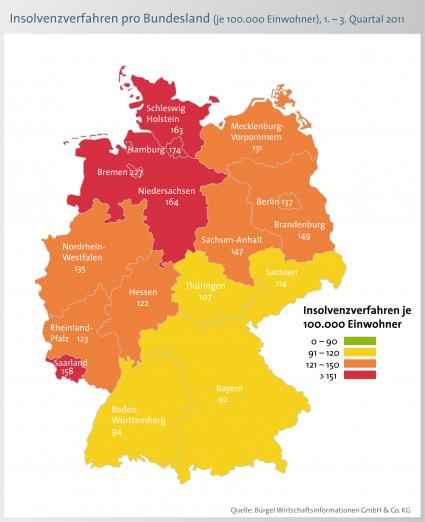 In der Detailanalyse bezogen auf die Einwohndichte schneiden die nördlichen Bundesländer schlechter ab. Am meisten Fälle meldet Bremen mit 227 Pleiten je 100.000 Einwohner, gefolgt von Hamburg (174), Niedersachsen (164) und Schleswig-Holstein (163). Der Bundesdurchschnitt bewegt sich bei 126 Fällen je 100.000 Einwohner. Am wenigsten Privatpleiten melden Bayern und Baden-Württemberg - mit 92 bzw. 94 Fällen je 100.000 Einwohner. Bild: obs/BÜRGEL Wirtschaftsinformationen GmbH & Co. KG
