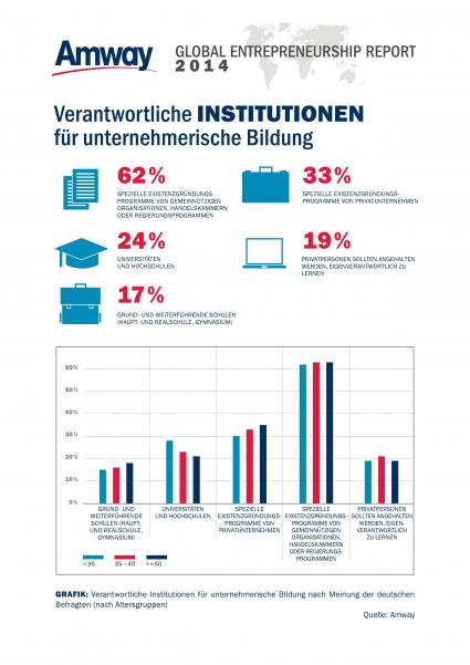 Amway Global Entrepreneurship Report 2014: Verantwortliche Institutionen für unternehmerische Bildung nach Meinung der deutschen Befragten (nach Altersgruppen). Bild: "obs/Amway GmbH"
