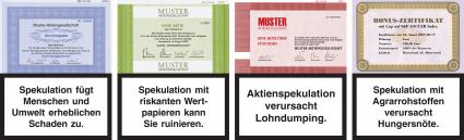 Warnhinweise auf Aktien und Zertifikaten: So könnten Verbraucher wirkungsvoll vor den Gefahren durch spekulative Finanzprodukte gewarnt werden. Bild: obs/World Future Council
