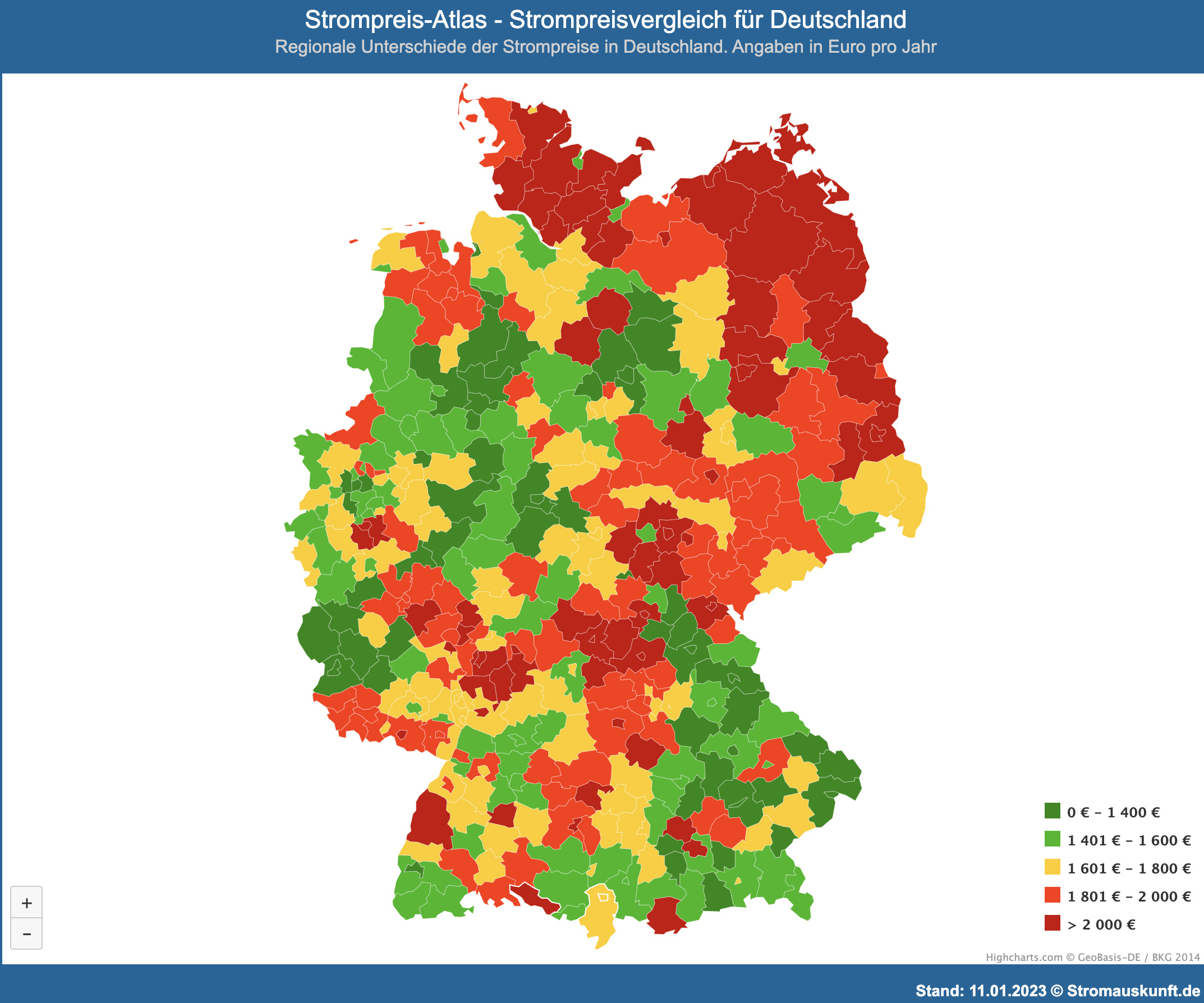 Der Strompreis-Atlas zeigt die aktuellen Stromkosten für Bundesländer, Landkreise und Städte in Deutschland an. Grundlage sind tägliche Analysen der Strompreise für rund 6.400 Städte und Gemeinden. Die Stromkosten sind farblich unterschiedlich dargestellt, so dass die Karte die regionalen Strompreisunterschiede auf einen Blick visualisiert.