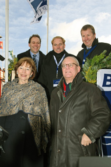 Hochzufrieden mit der Taufe: Stephan Wrage, Geschäftsführender Gesellschafter der SkySails GmbH & Co. KG, Niels Stolberg, Geschäftsführender Gesellschafter der Beluga Shipping GmbH, Lutz Stratmann, Niedersächsischer Minister für Wissenschaft und Kultur ( v.l., obere Reihe); Eva Luise Köhler, Gattin des Deutschen Bundespräsidenten und Taufpatin des MS „Beluga SkySails", Gunnar Uldall, Senator für Wirtschaft und Arbeit, Hamburg ( v.l. untere Reihe). Bild: Beluga Shipping GmbH