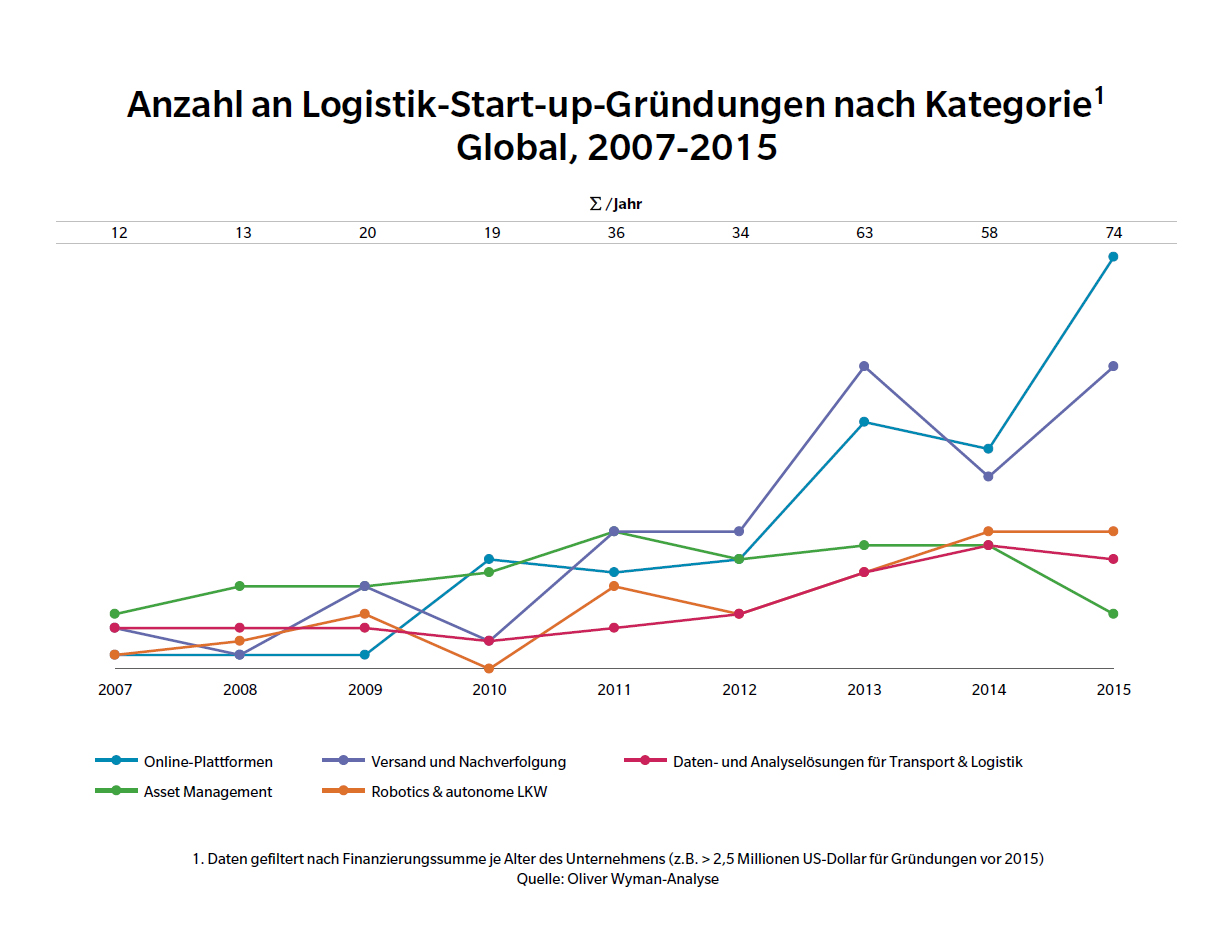 Der Großteil der Logistik-Start-ups operiert in Feldern, die skalierbare Plattformen ermöglichen und geringe Fixkosten erfordern. Start-ups rollen Logistikbranche auf. Oliver Wyman-Analyse zur Digitalisierung im Speditionsgeschäft Bild: "obs/Oliver Wyman"