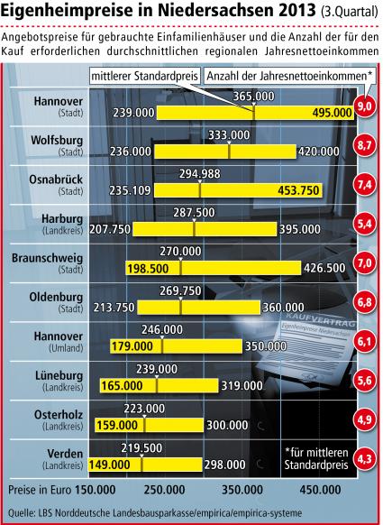 In den größeren niedersächsischen Städten sind die Eigenheimpreise in den letzten fünf Jahren zum Teil deutlich gestiegen. Aktuell am teuersten ist die Stadt Hannover mit einem Standardpreis von 365.000 Euro für gebrauchte frei stehende Einfamilienhäuser. Bild: "obs/LBS Norddeutsche Landesbausparkasse Berlin - Hannover"