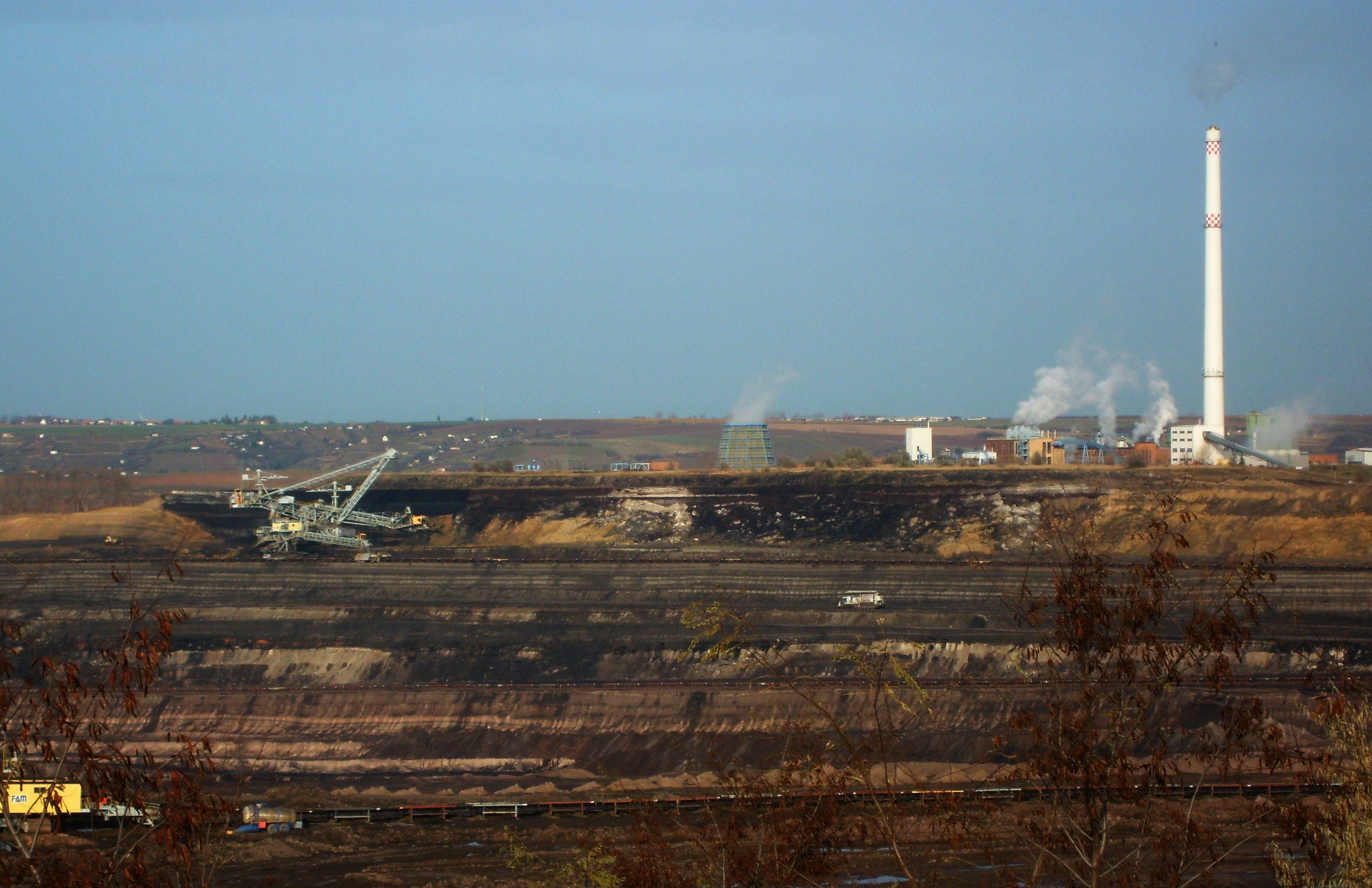 Blick über den Tagebau Amsdorf zum Kraftwerk Amsdorf, beide betrieben von Romonta