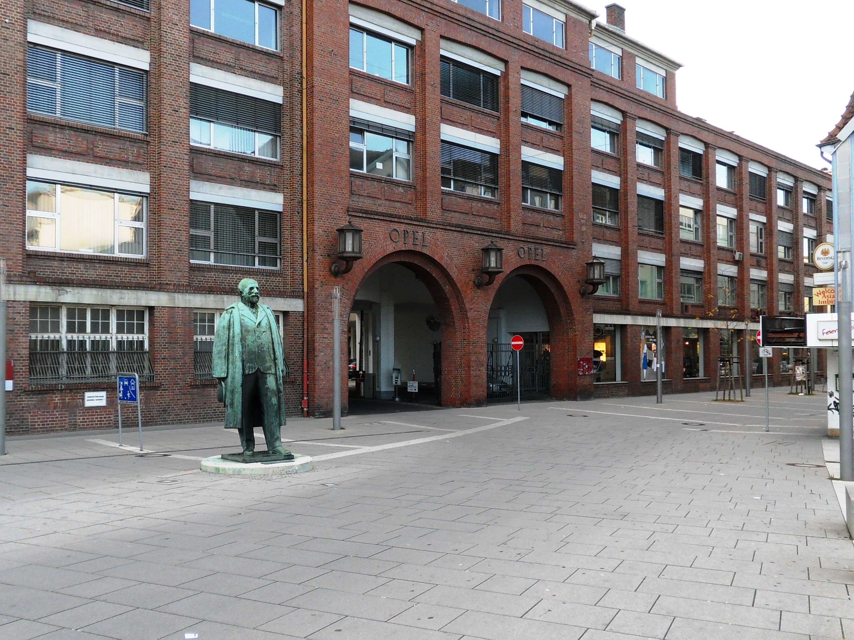 Opel-Hauptportal und Portalgebäude in Rüsselsheim in der Nähe des Bahnhofs, davor das Denkmal des Unternehmensgründers Adam Opel