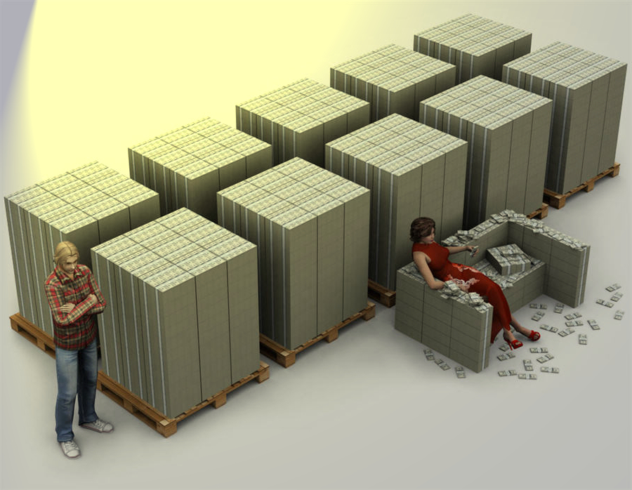 Größenvergleich: Das ist eine Milliarde Euro in 100 Euro-Scheinen. Um dies zu erwirtschaften müßte ein durchschnittlicher Arbeiter 92.000 Jahre arbeiten. Die Couch in der Mitte ist knapp 47 Millionen Euro schwer.