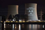 Greenpeace-Projektion am Reaktor Biblis A in der Nacht vor der RWE-Kundgebung.