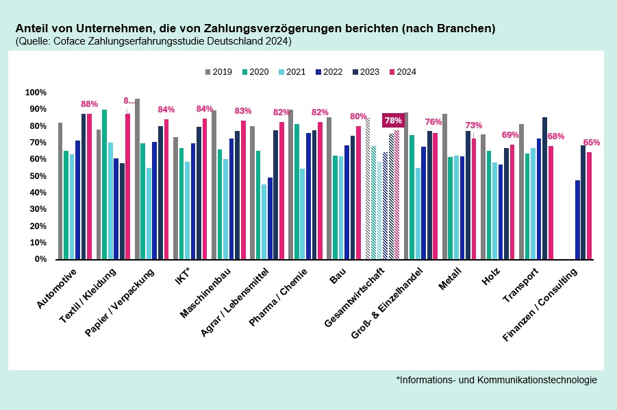 Der Anteil von deutschen Unternehmen, die von Zahlungsverzögerungen berichten, ist 2024 auf 78 Prozent gestiegen.