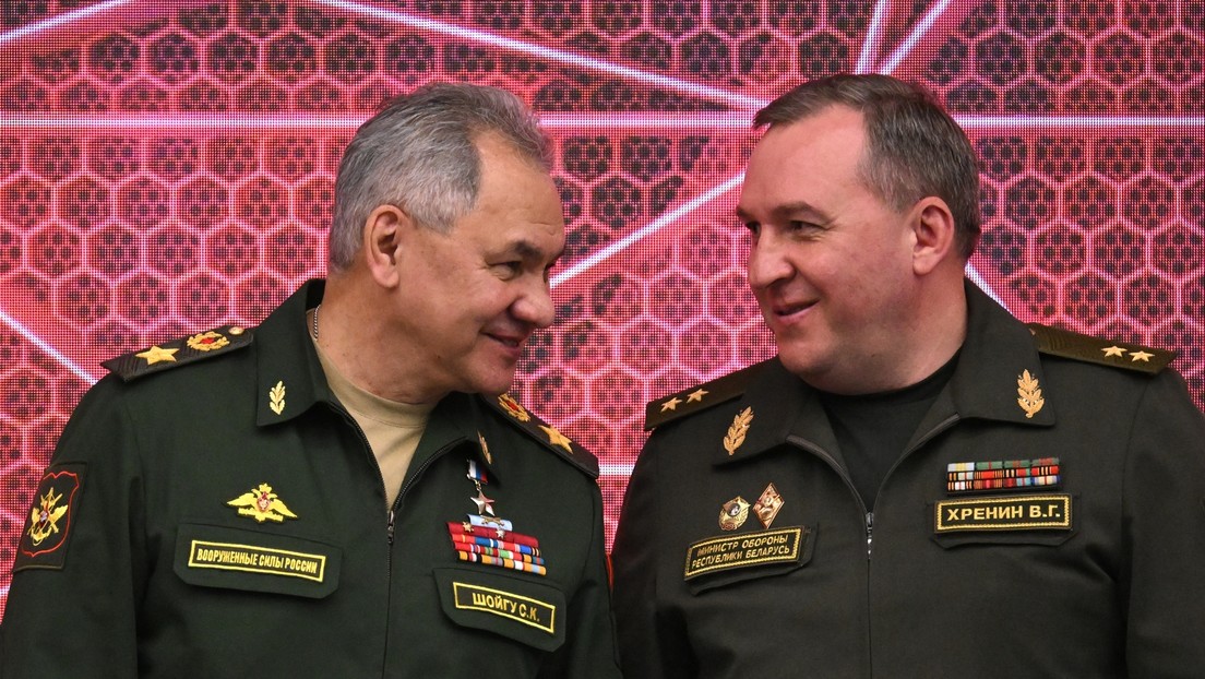 Der russische Verteidigungsminister Sergei Schoigu und sein weißrussischer Amtskollege Viktor Khrenin bei der Eröffnung der Ausstellung "Armee 23" (2023) Bild: Sputnik / Maksim Blinov