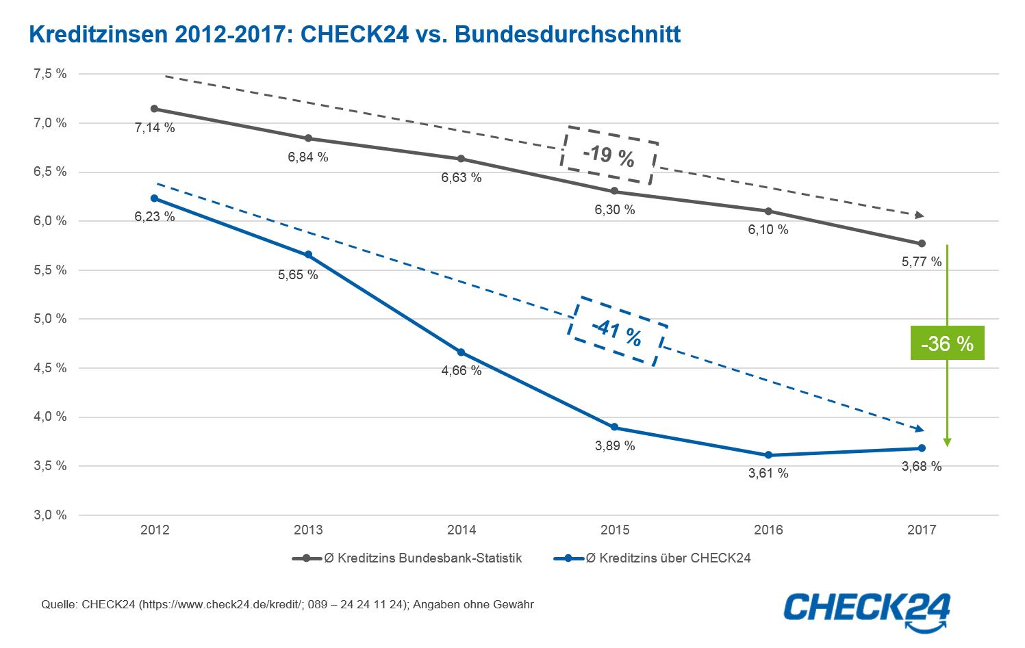 Kreditzinsen 2012-2017: CHECK24 vs. Bundesdurchschnitt Bild: "obs/CHECK24 GmbH"