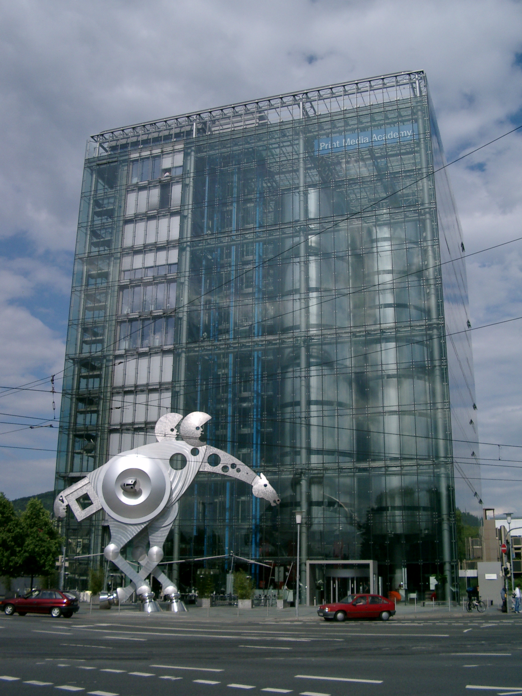 Heidelberger Druckmaschinen: Print Media Academy: Büro- und Schulungsgebäude am Hauptsitz in Heidelberg. Im Vordergrund das „S-Printing Horse“