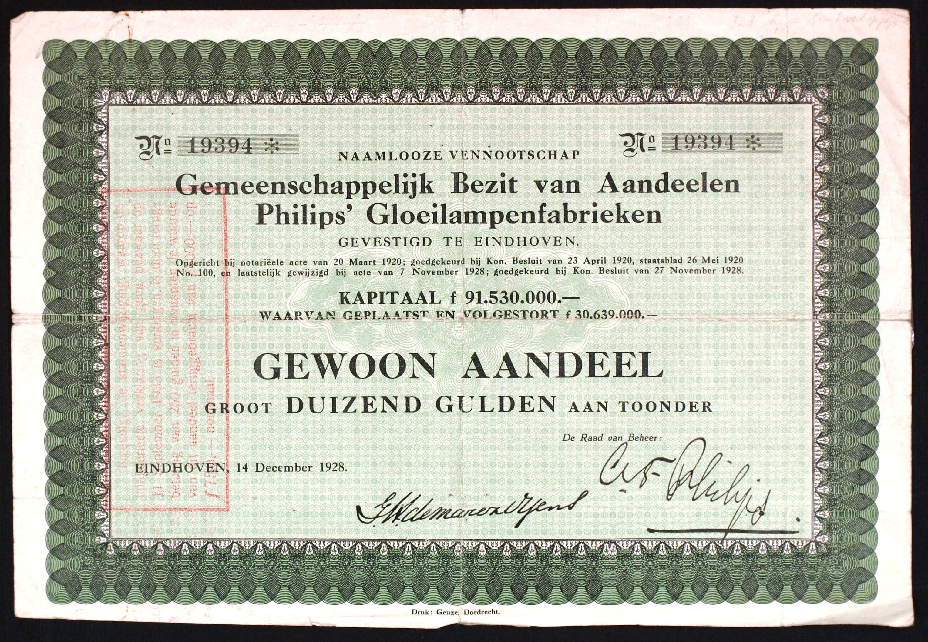 Aktie über 1000 Gulden der Philips’ Gloeilampenfabrieken vom 14. Dezember 1928 (Symbolbild)
