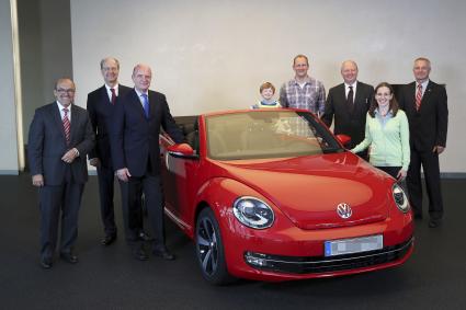 Zweimillionste Fahrzeugauslieferung in der Autostadt in Wolfsburg: v.l. Christian Klingler, Vorstand Marketing und Vertrieb der Volkswagen AG, Hans Dieter Pötsch, Vorstand für Finanzen und Controlling der Volkswagen AG, Bernd Osterloh, Vorsitzender Gesamt- und Konzernbetriebsrat der Volkswagen AG, Otto F. Wachs, Geschäftsführer der Autostadt, und Thomas Zahn, Leiter Marketing und Vertrieb Deutschland Volkswagen Pkw, übergeben das Beetle Cabriolet an Familie Reck mit ihrem dreijährigen Sohn aus Wermelskirchen. Mit dem Erreichen der Zweimillionenmarke unterstreicht die Kommunikationsplattform des Volkswagen Konzerns erneut ihre weltweit führende Stellung als Automobildestination. Bild: "obs/Autostadt GmbH"