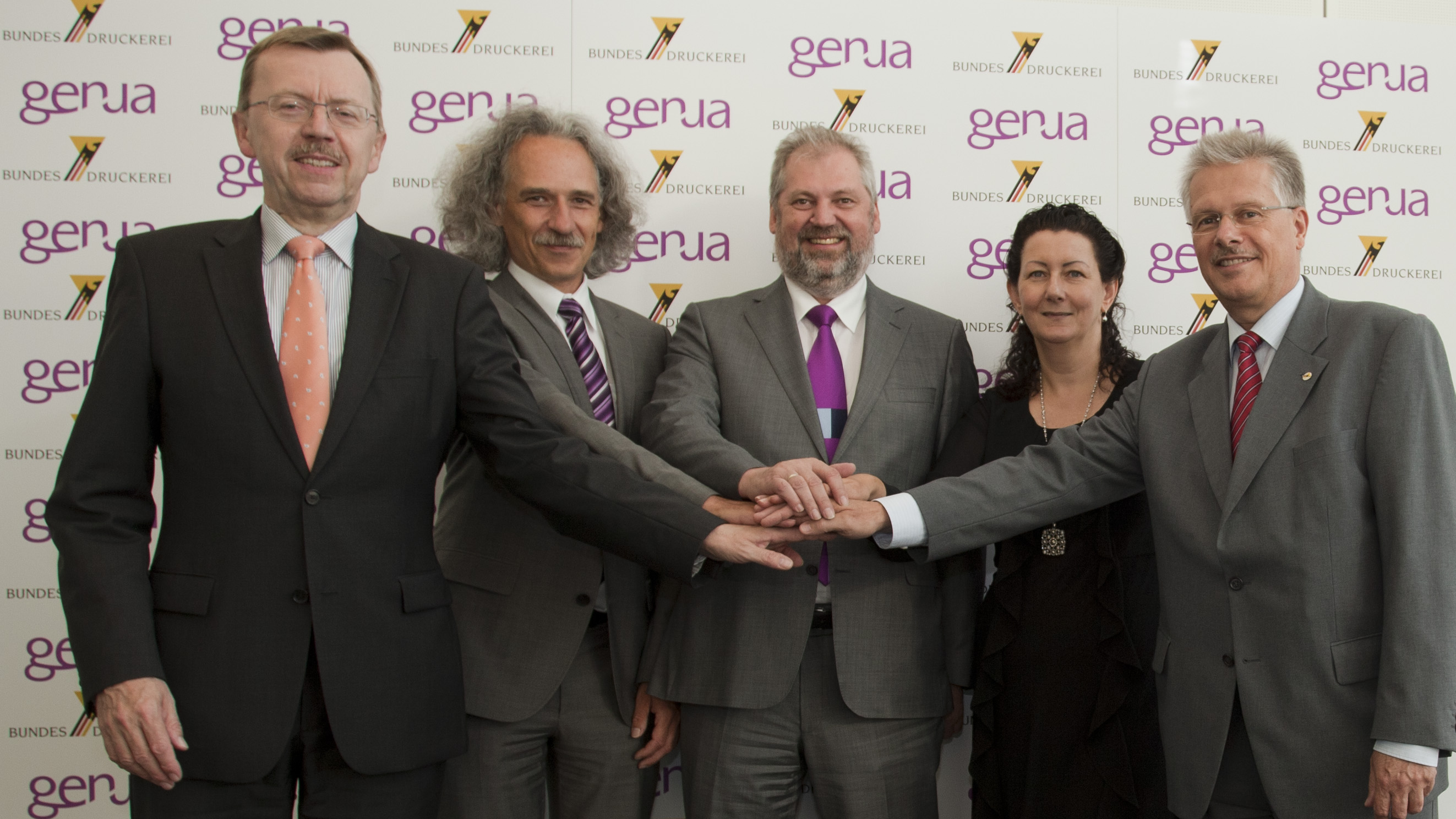 Heinz-Otto Meyn (Bereichsleiter Corporate Strategy & Planning, Bundesdruckerei), die Firmengründer von genua Bernhard Schneck, Dr. Magnus Harlander und Dr. Michaela Harlander sowie der Vorsitzende der Geschäftsführung der Bundesdruckerei Ulrich Hamann (v. l. n. r.) beschließen die künftige Zusammenarbeit. Bild: "obs/Bundesdruckerei GmbH"