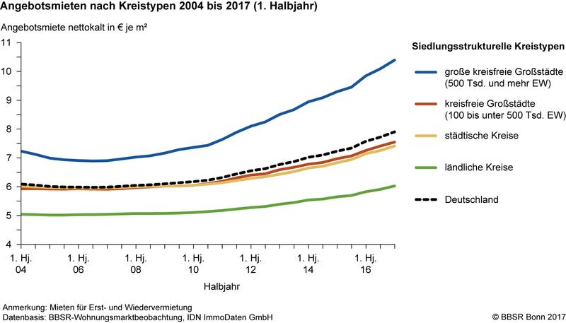 Entwicklung der Angebotsmieten 2004 bis 1. Halbjahr 2017 Quelle: BBSR (idw)