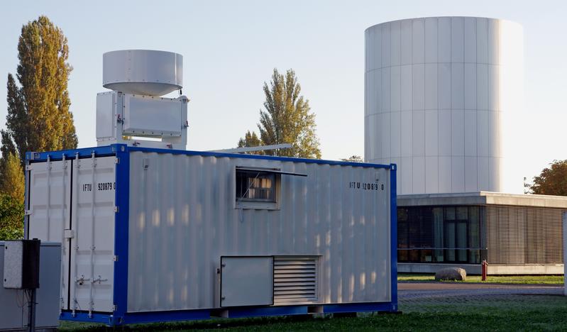 Das mobile Wolkenradar LACROS (im Bild links vor dem stationären Wolkenlabor LACIS) ist eines von 20 Fernerkundungsgeräten, die während der Messkampagne HOPE zum Einsatz kommen , um möglichst viele Wettersituationen einzufangen und so das Wissen über Wolken- und Niederschlagsbildung zu verbessern. Quelle: Foto: Patric Seifert/ TROPOS (idw)