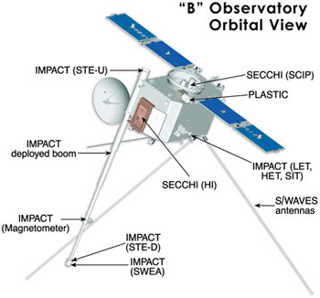 Abb. 3: Eine der beiden STEREO-Sonden mit den drei Sonnenteleskopen (Experiment SECCHI/SCIP), der Weitwinkelkamera (SECCHI/HI), den Teilchensensoren (IMPACT und PLASTIC) und dem Radiowellenexperiment (SWAVES). Während die blauen Sonnensegel der Sonne zugewandt sind, zeigt die Parabolantenne links in Richtung der Erde. Bild: Johns Hopkins University, Laurel, MD