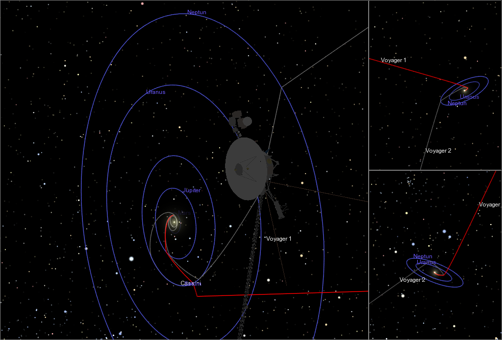 Position und Kurs von Voyager 1 (rot) und Voyager 2 am 15. Februar 2009 aus drei verschiedenen Perspektiven
