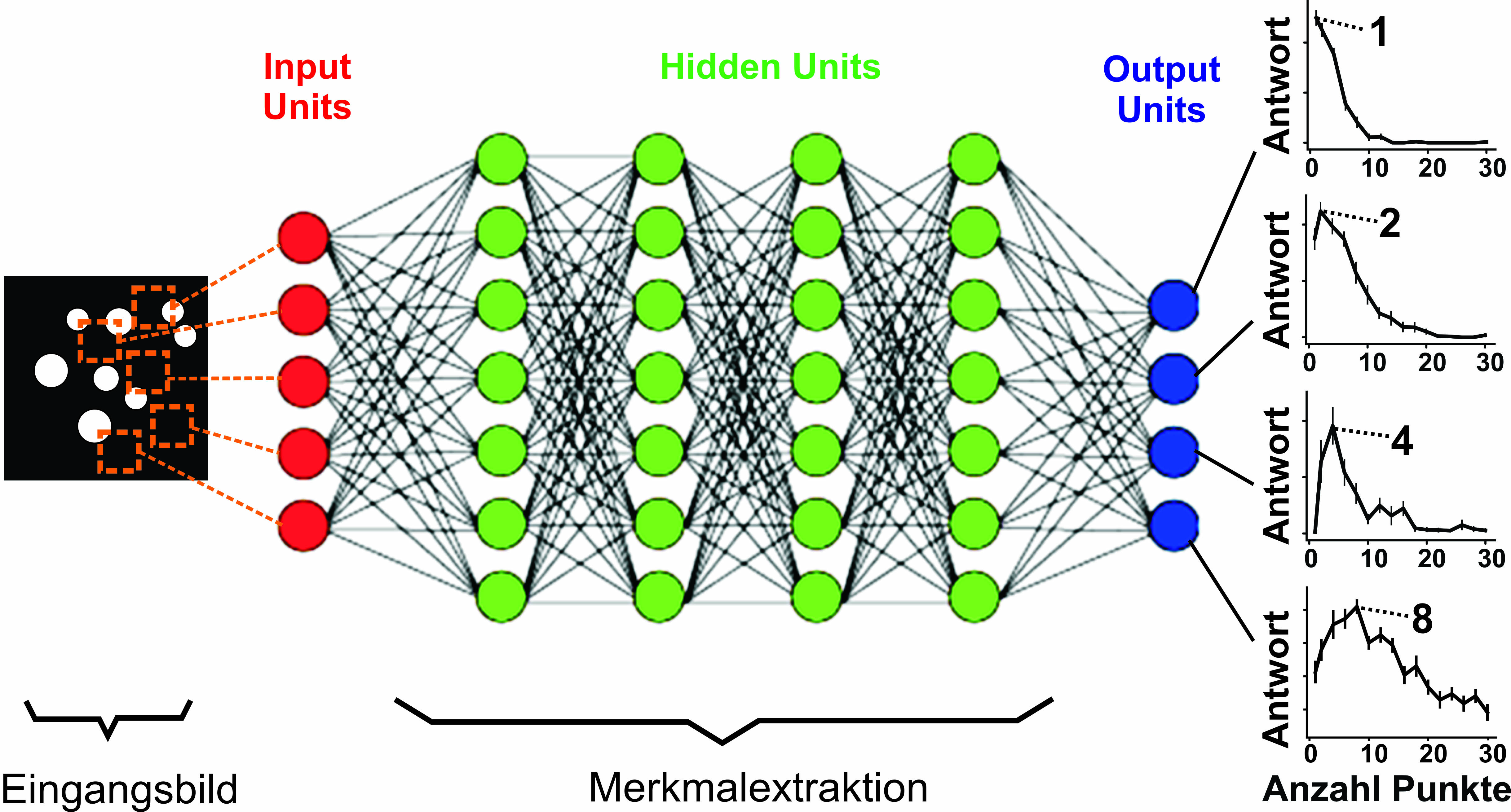 In einem ‚deep-learning’-Netzwerk, das lediglich auf die Zuordnung von Fotos trainiert wurde, bilden sich spontan künstliche Neuronen heraus, die auf verschiedene Lieblingszahlen abgestimmt sind. Bild: Andreas Nieder (idw)