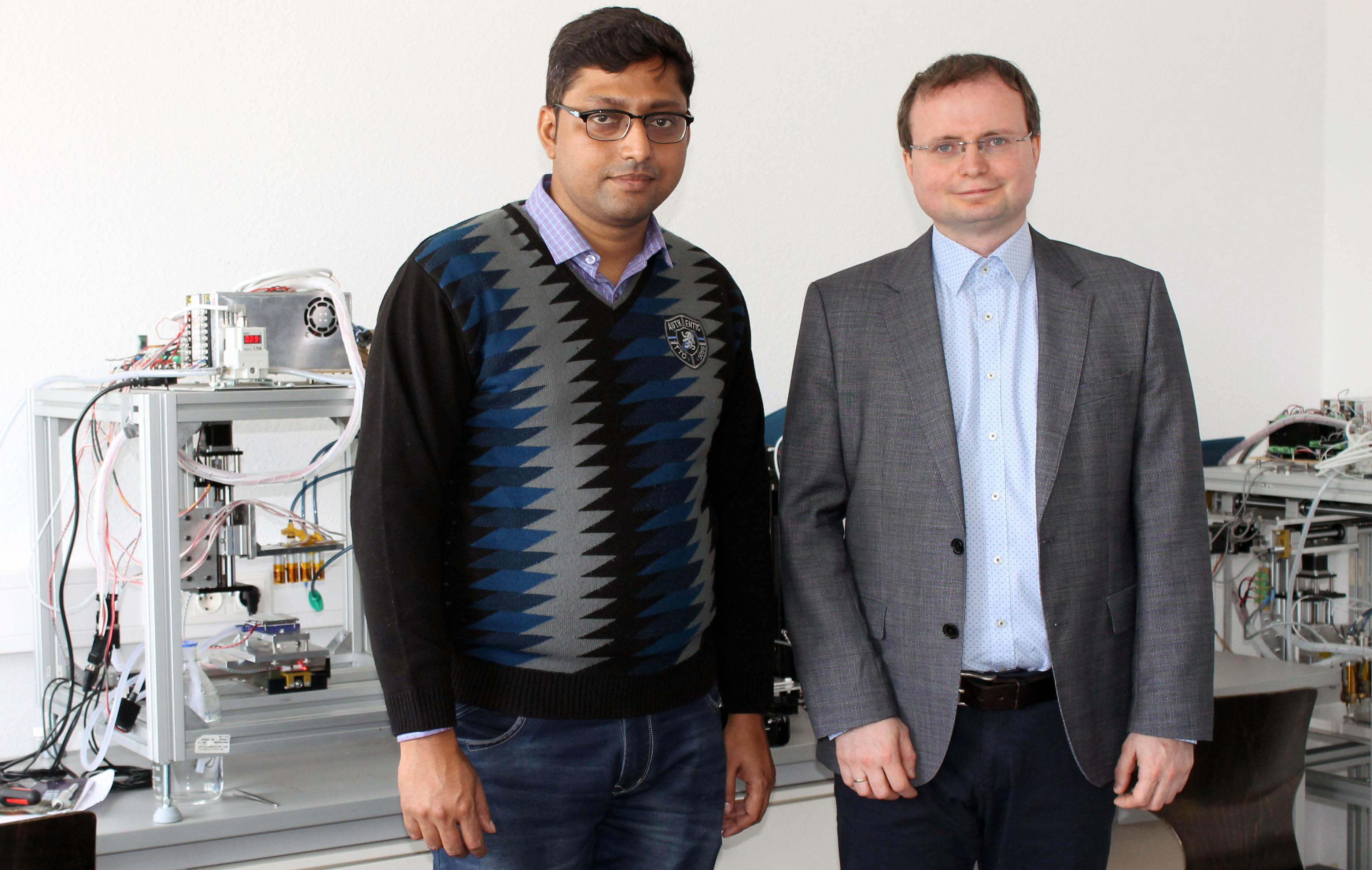 Dr. Arpan Biswas, Postdoc am Lehrstuhl für Biofabrikation der Universität Bayreuth, und Lehrstuhlinhaber Prof. Dr. Leonid Ionov (v.l.). Quelle: Foto: Christian Wißler. (idw)