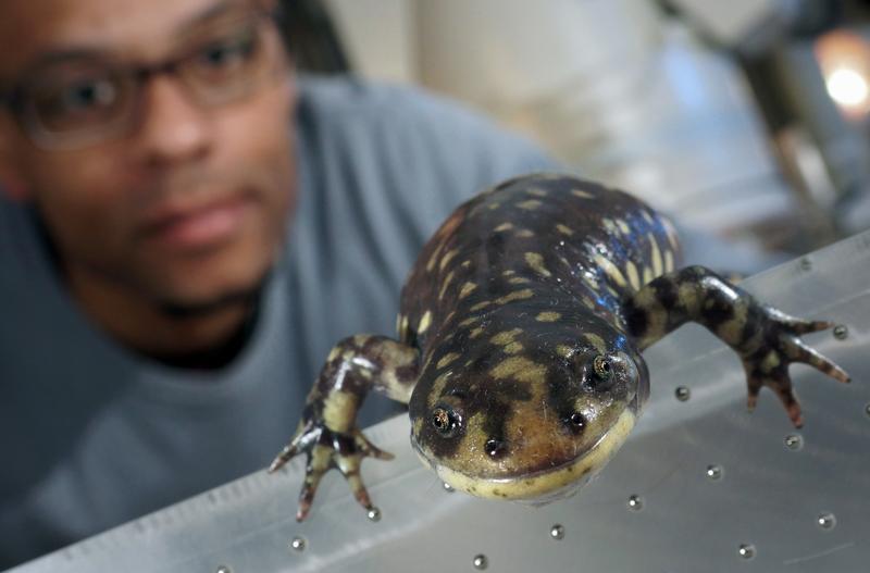 Mit einer der schnellsten Röntgenvideoanlagen der Welt wird Dr. John Nyakatura von der Universität Jena u. a. die Salamander-Dame "Lotte" beim Laufen beobachten. Quelle: Foto: Jan-Peter Kasper/FSU (idw)
