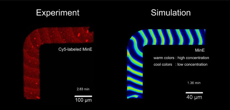 Wellenmuster auf einer Membran, die die Form des Buchstabens „L“ hat: Sowohl im Experiment (links) als auch in den computergestützten Simulationen (rechts) ändern die Proteinwellen an der Knickstelle des Buchstabens ihre Richtung, um dem längsten Weg zu folgen. Die weißen Pfeile geben die Bewegungsrichtung der laufenden Wellen an. Quelle: Abbildung: Universität des Saarlandes (idw)