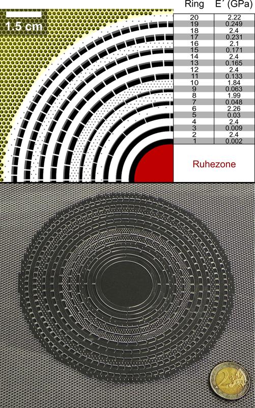 Im „Kreisverkehr“ um das ruhige Zentrum: Design (oben) und Zwischenschritt der Herstellung (unten) der elastischen Tarnkappe (Grafik: AP, KIT) Quelle: (idw)