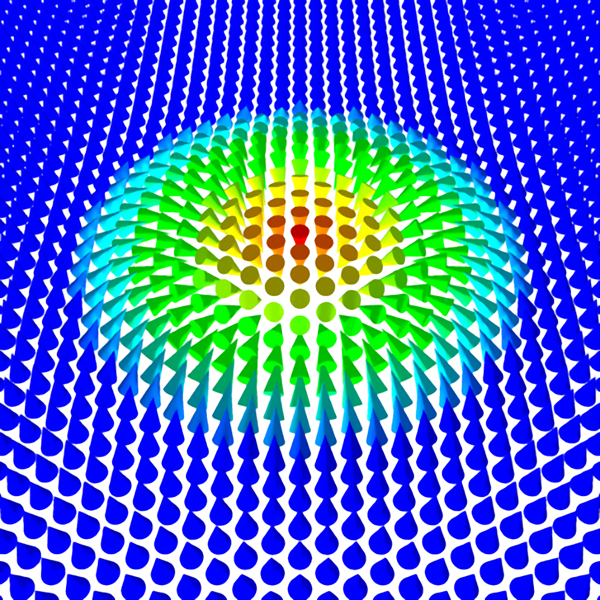 Abb. 1: Illustration eines magnetischen Skyrmions mit einem Durchmesser von nur wenigen Nanometern in einem atomar dünnen Kobaltfilm. Quelle: S. Meyer, CAU Kiel (idw)