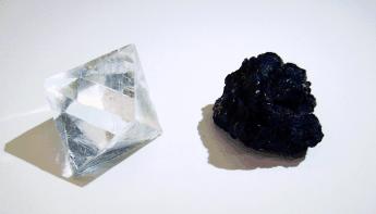 Stinkspat (rechts) ist eine dunkelviolette Form des Flussspat, die elementares Fluor enthält. Quelle: (c) Wiley-VCH (idw)