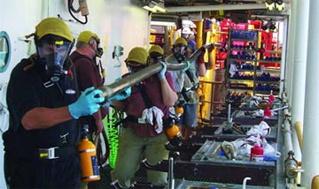 Ein frischer Bohrkern kommt an Deck. Die Wissenschaftler auf dem Forschungsschiff "Joides Resolution" schützen sich vor dem aufsteigenden giftigen Schwefelwasserstoff mit Gasmasken. Bild: Max-Planck-Institut für marine Mikrobiologie