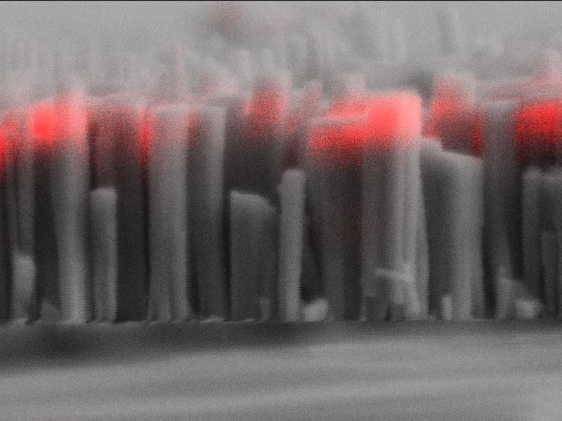 Die oberste Schicht der GaN-Nanosäulen strahlt in einer anderen Wellenlänge, weil hier die Materialzusammensetzung verändert ist. Die Aufnahmen entstanden im Rasterelektronenmikroskop kombiniert mit Kathodolumineszensspektroskopie. Bild: PDI