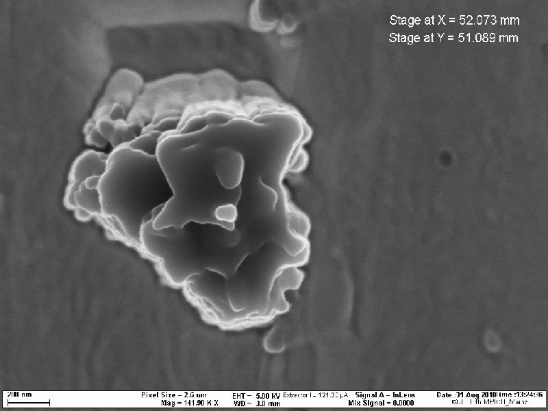 Sternenstaub aus einer Supernova: Die elektronenmikroskopische Aufnahme zeigt ein Siliziumkarbid-Korn aus dem Meteoriten Murchison. Das im Durchmesser knapp einen Mikrometer große Staubteilchen stammt aus einer Supernova, wie eine Analyse von Isotopen – das sind unterschiedlich schwere Formen eines Elementes – ergeben haben. Quelle: Bild: Peter Hoppe, MPI für Chemie (idw)