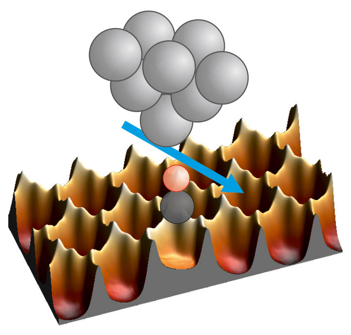 CO-Moleküle auf Metallatomen, die hier als Vertiefungen dargestellt sind. Beim Verschieben müssen si Quelle: Foto: Universität Regensburg – Zur ausschließlichen Verwendung im Rahmen der Berichterstattung zu dieser Pressemitteilung. (idw)