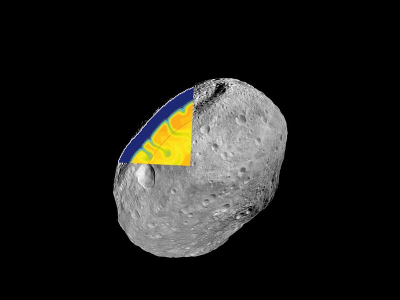 Abbildung des Asteroiden Vesta, aufgenommen im Rahmen der DAWN-Mission der NASA. Zur Verdeutlichung erlaubt diese Darstellung den Blick in das Innere eines Vesta-großen Asteroiden etwa 50 Mio Jahre nach dessen Bildung. Quelle: NASA/JPL-Caltech/DLR/Goethe-Universität/ETH (idw)