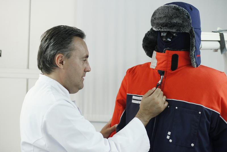 Kein Nässegefühl mehr - optimierte Wärmeschutzkleidung wird an den Hohenstein Instituten mit Hilfe der Testpuppe "Charlie" getestet. Quelle: © Hohenstein Institute (idw)