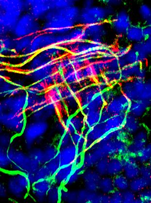 Antikörperfärbung eines Haarfollikels: Durch Kopplung der Antikörper an verschiedene Farbstoffe können unterschiedliche Strukturen mikroskopisch sichtbar gemacht werden. Man sieht im Haarfollikel endende Nervenendigungen (grün), in denen elektrische Impulse durch mechanische Reize der Haut erzeugt werden. In diesen Endigungen sind KCNQ4 Kaliumkanäle lokalisiert (rot), welche die Generierung dieser Nervenimpulse regulieren. Ovale und runde Strukturen in Blau zeigen Zellkerne von Zellen in der Haut. Quelle: Grafik: M. Heidenreich (idw)